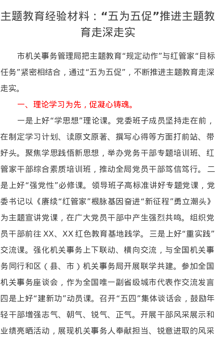 主题教育经验材料:“五为五促”推进主题教育走深走实(特色社会主义思想)