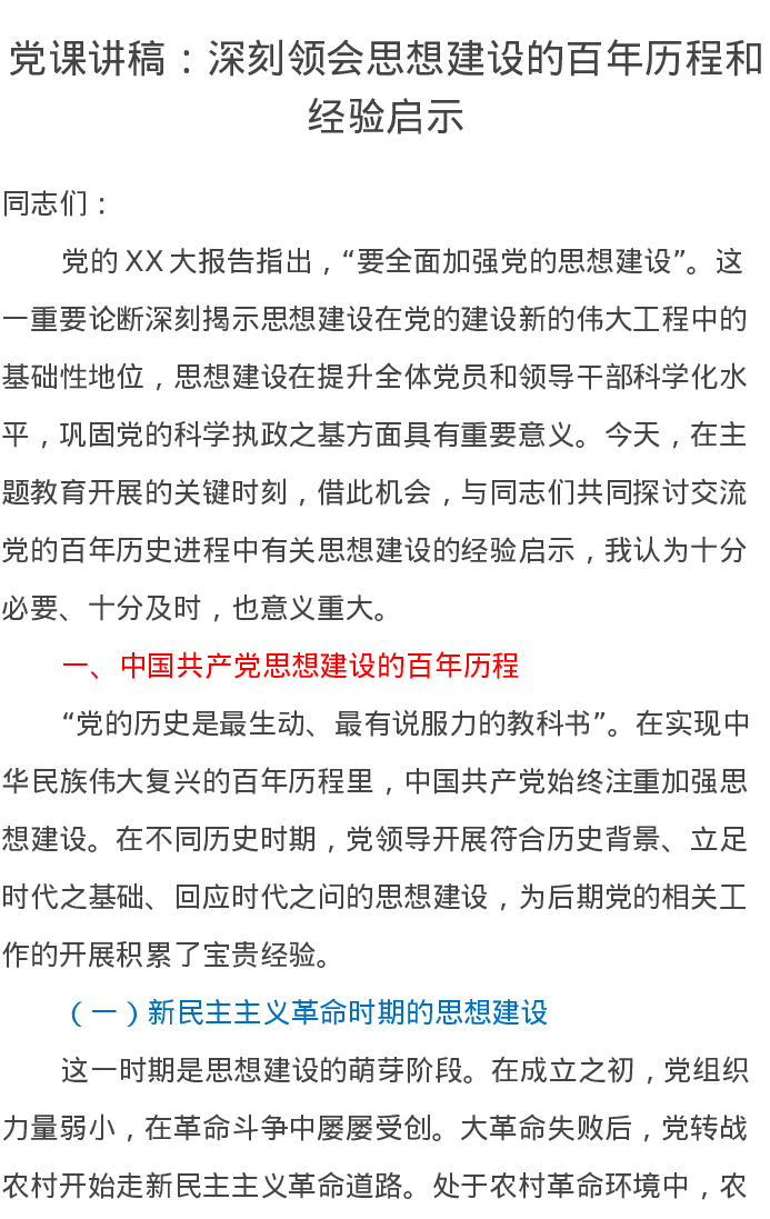党课讲稿:深刻领会思想建设的百年历程和经验启示