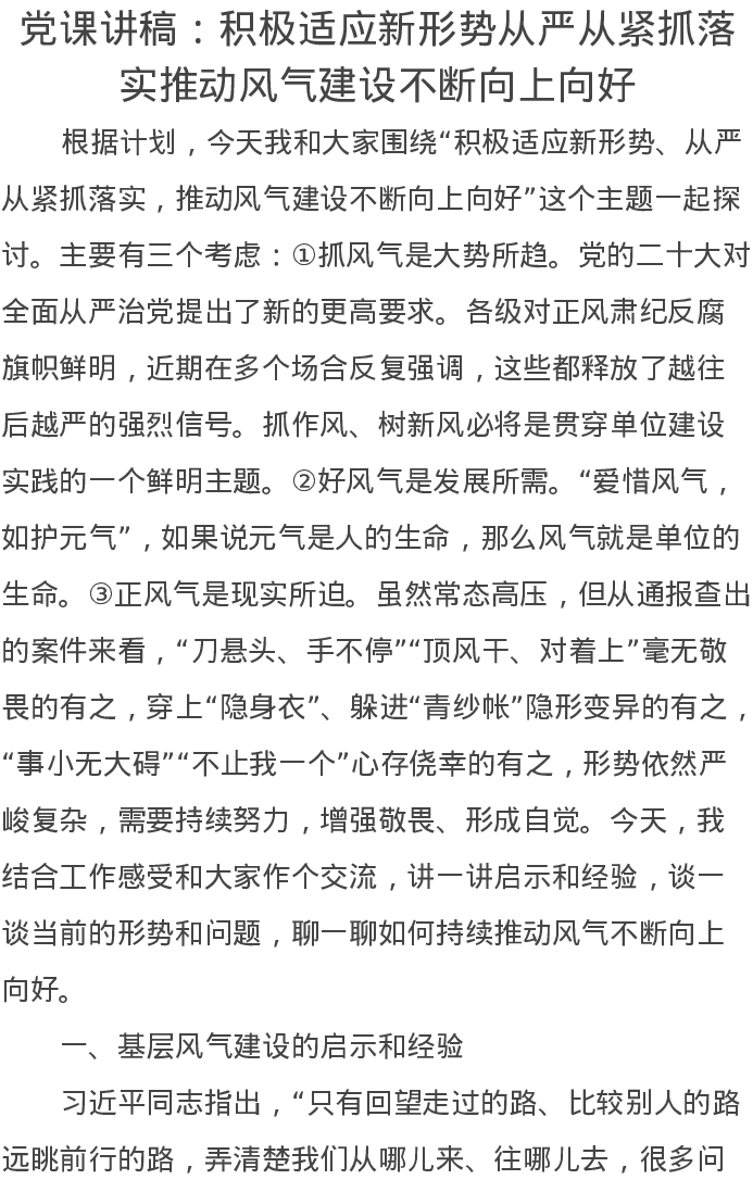 党课讲稿:积极适应新形势从严从紧抓落实推动风气建设不断向上向好