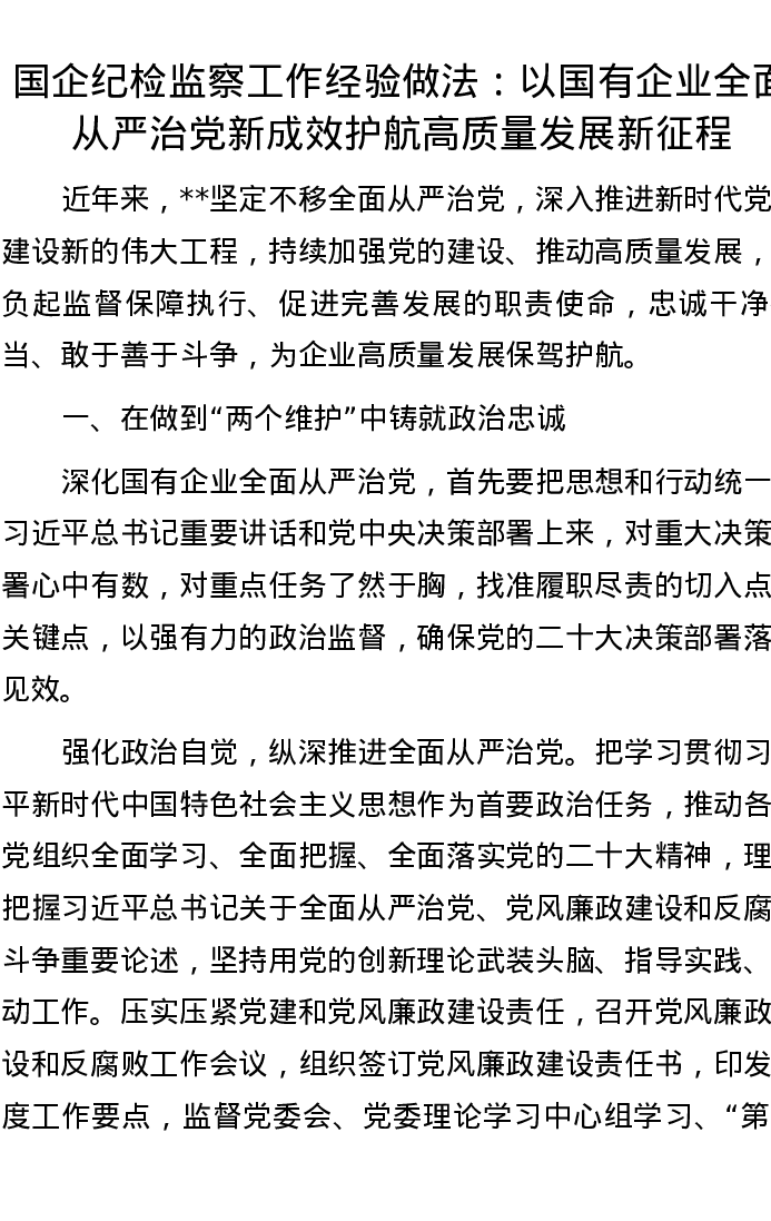 国企纪检监察工作经验做法:以国有企业全面从严治党新成效 护航高质量发展新征程