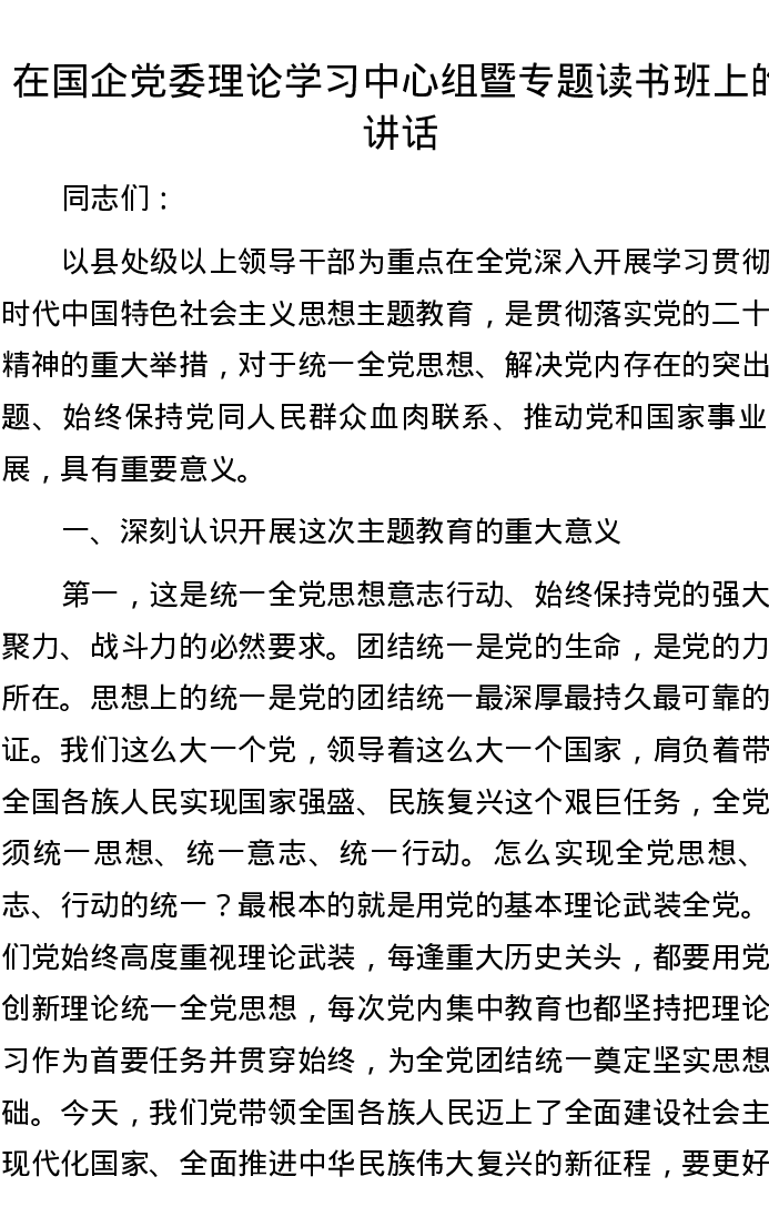 在国企党委理论学习中心组暨专题读书班上的讲话