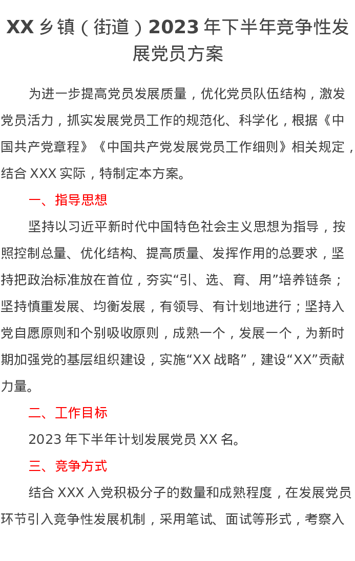 XX乡镇(街道)2023年下半年竞争性发展党员方案