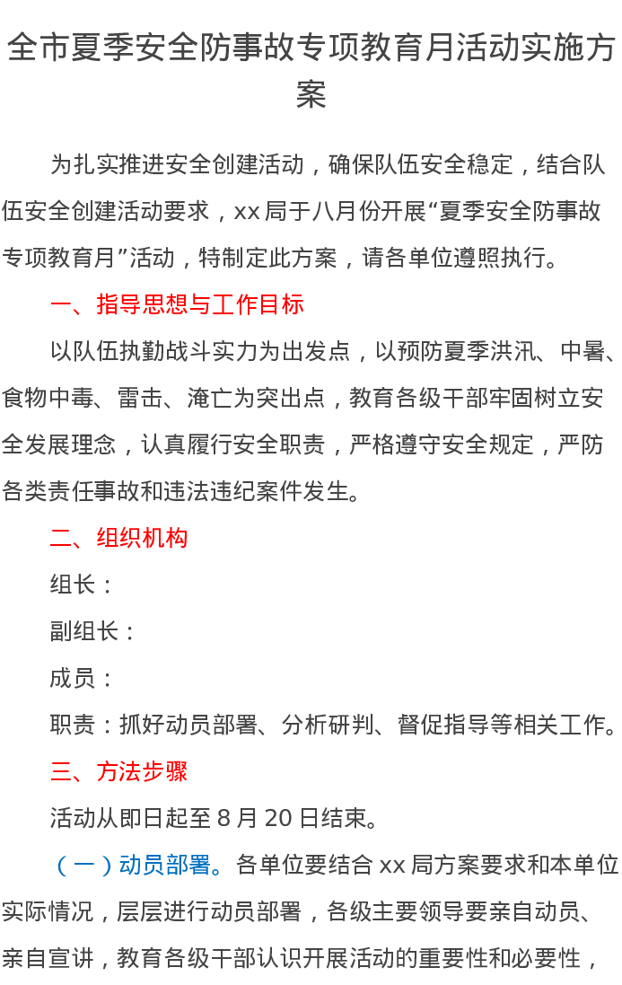 全市夏季安全防事故专项教育月活动实施方案