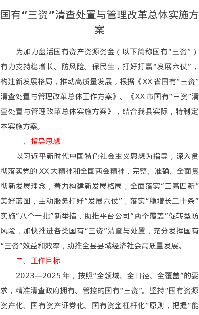 国有“三资”清查处置与管理改革总体实施方案