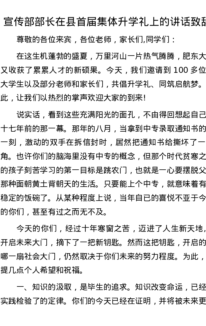 宣传部部长在县首届集体升学礼上的讲话致辞