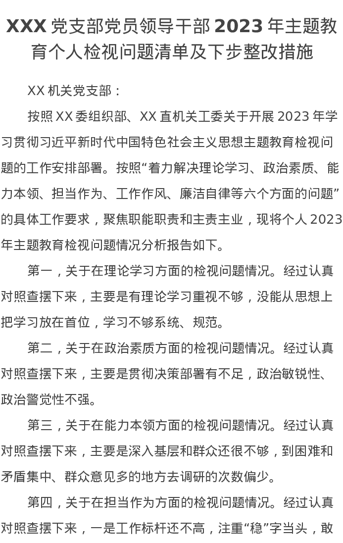 XXX党支部党员领导干部2023年主题教育个人检视问题清单及下步整改措施(特色社会主义思想)