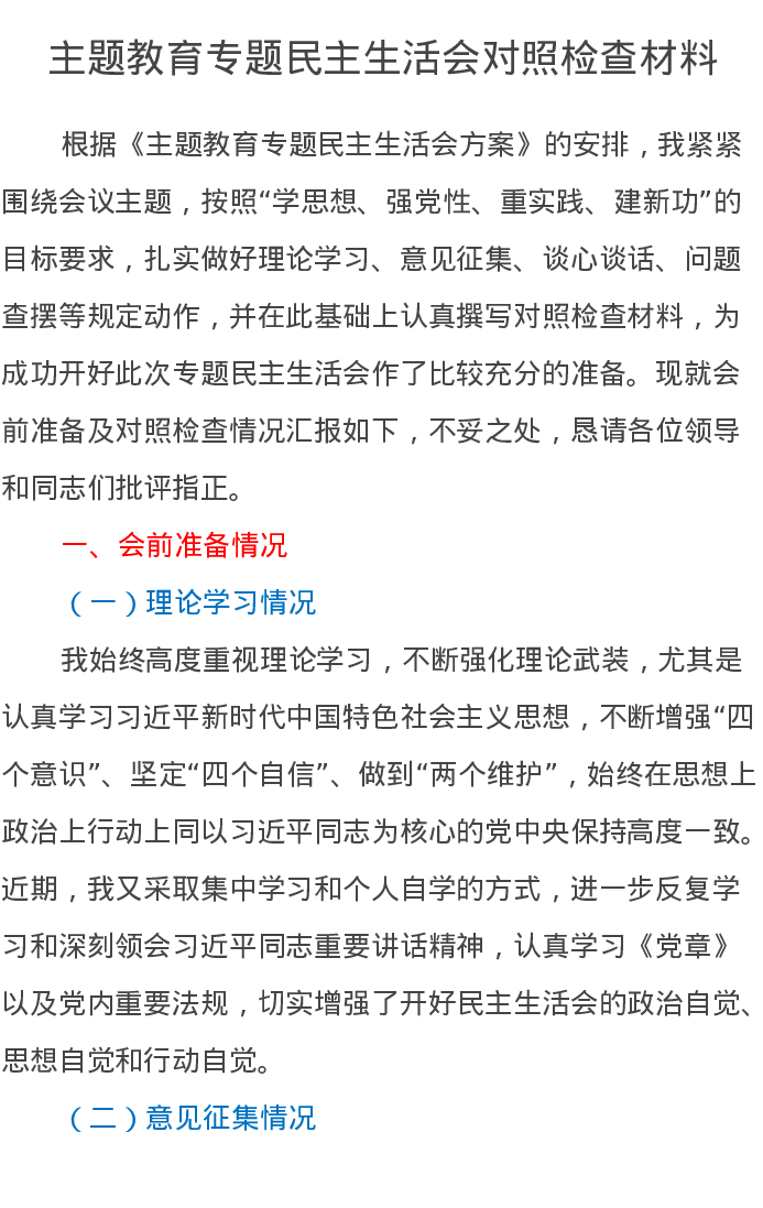 主题教育专题民主生活会对照检查材料(特色社会主义思想)