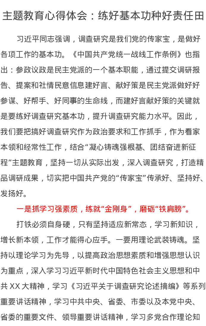 主题教育心得体会:练好基本功种好责任田(特色社会主义思想)