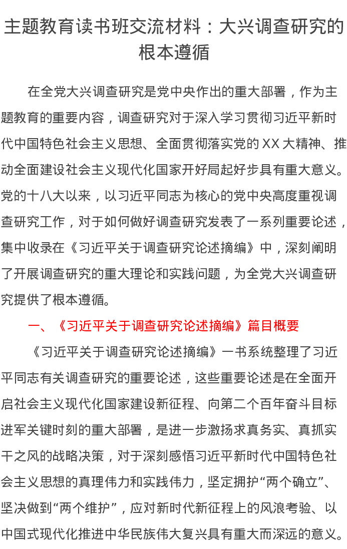 主题教育读书班交流材料:大兴调查研究的根本遵循(特色社会主义思想)