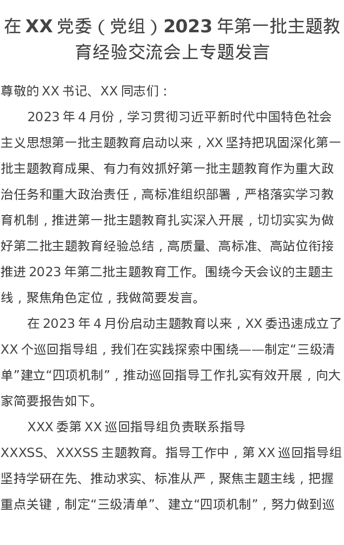 在XX党委(党组)2023年第一批主题教育经验交流会上专题发言(特色社会主义思想)