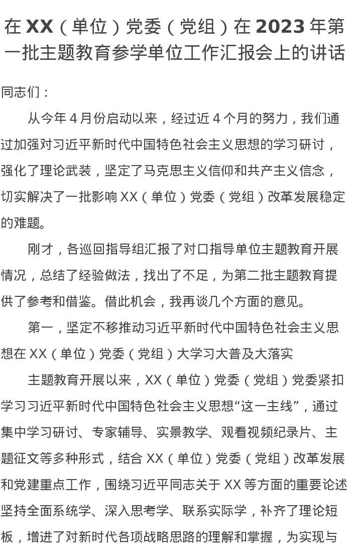 在XX(单位)党委(党组)在2023年第一批主题教育参学单位工作汇报会上的讲话(特色社会主义思想)