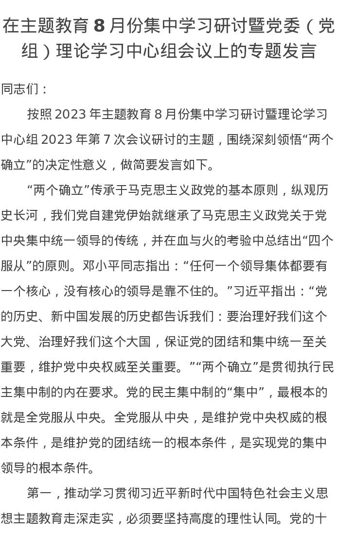 在主题教育8月份集中学习研讨暨党委(党组)理论学习中心组会议上的专题发言(特色社会主义思想)