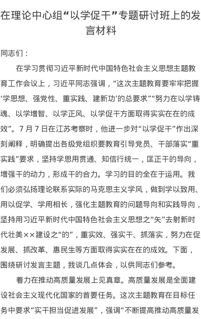 在理论中心组“以学促干”专题研讨班上的发言材料(特色社会主义思想主题教育)
