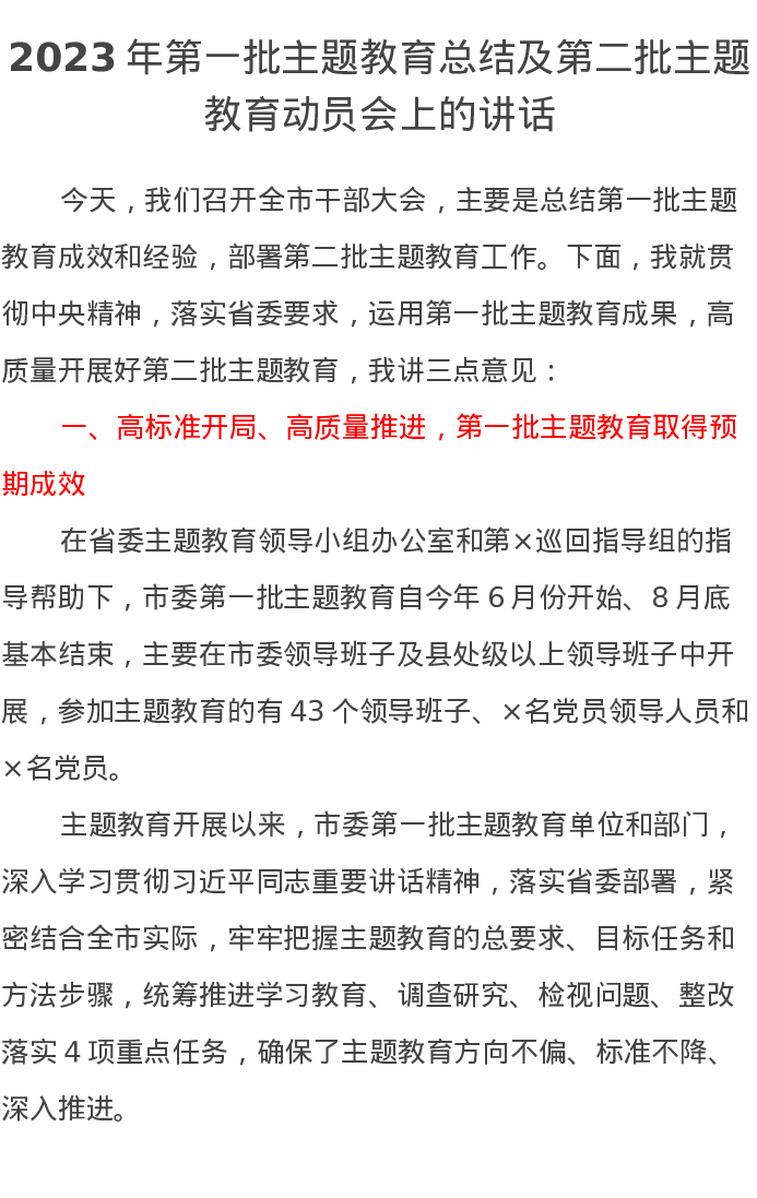 2023年第一批主题教育总结及第二批主题教育动员会上的讲话(特色社会主义思想)