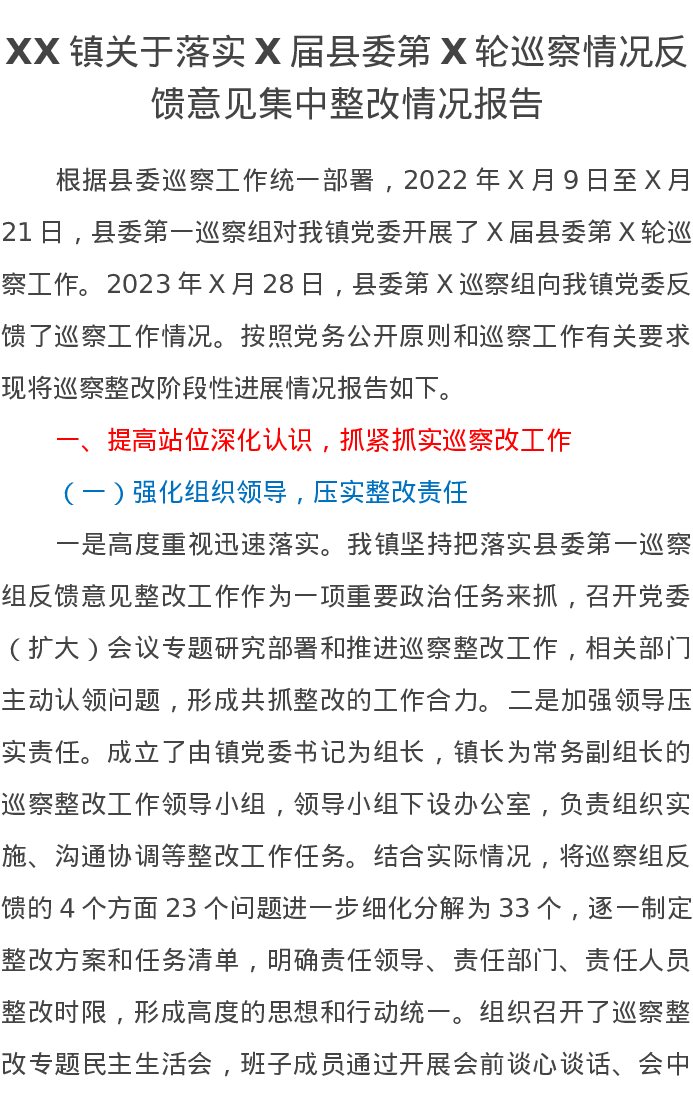 XX镇关于落实X届县委第X轮巡察情况反馈意见集中整改情况报告