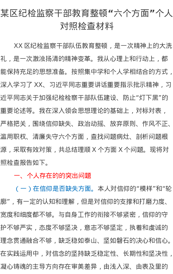 某区纪检监察干部教育整顿“六个方面”个人对照检查材料