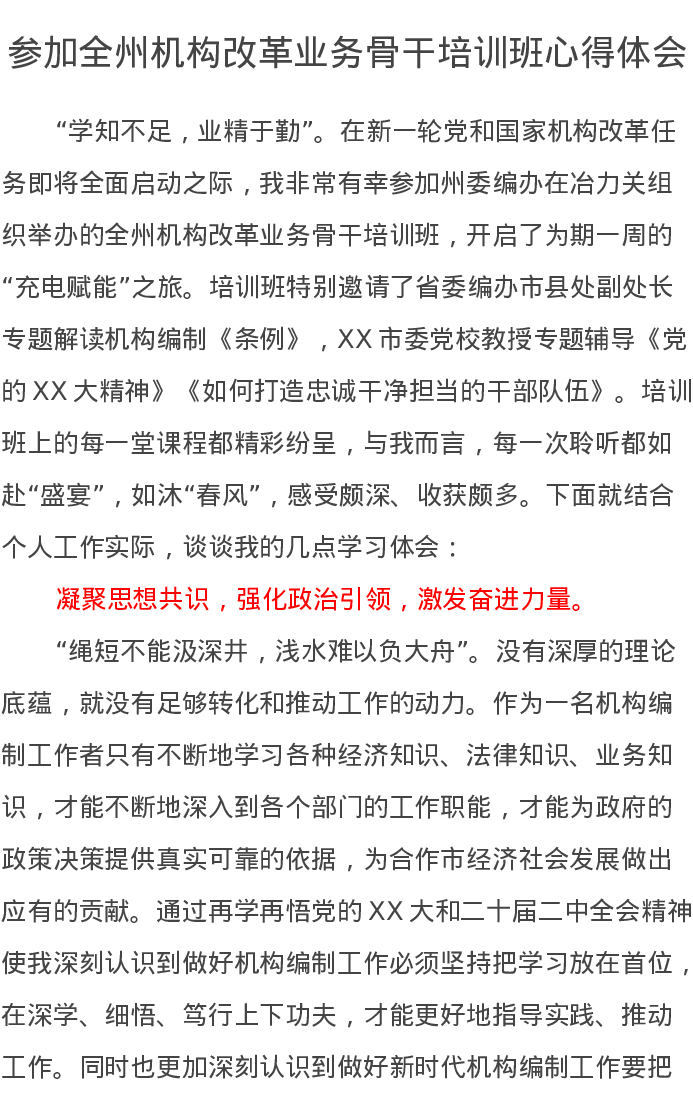 参加全州机构改革业务骨干培训班心得体会