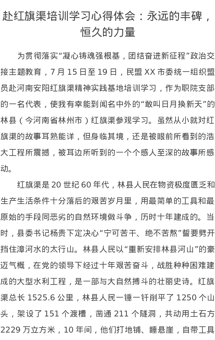 赴红旗渠培训学习心得体会:永远的丰碑,恒久的力量