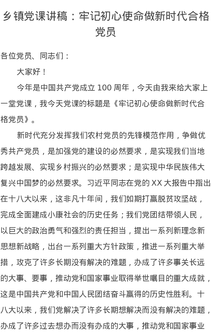 乡镇党课讲稿:牢记初心使命做新时代合格党员