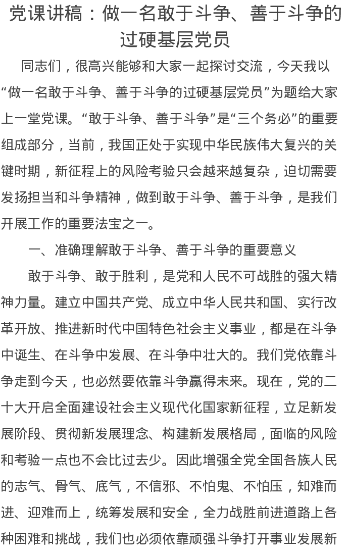 党课讲稿:做一名敢于斗争、善于斗争的过硬基层党员