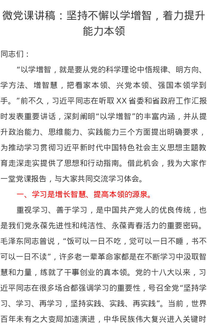 微党课讲稿:坚持不懈以学增智,着力提升能力本领
