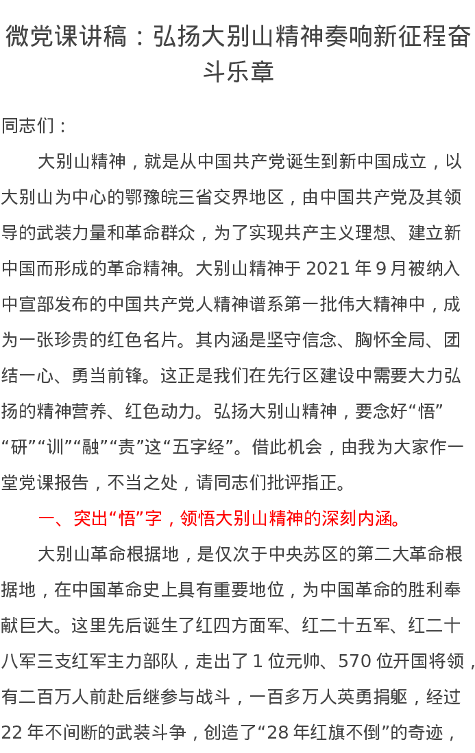 微党课讲稿:弘扬大别山精神奏响新征程奋斗乐章