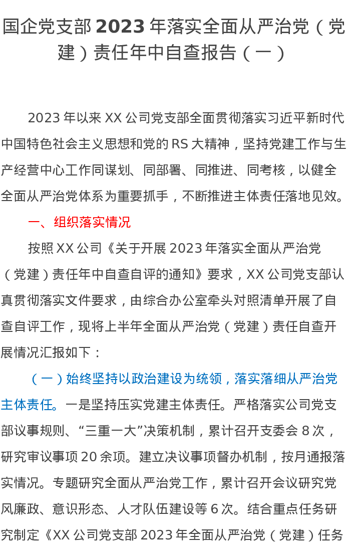 国企党支部2023年落实全面从严治党(党建)责任年中自查报告(一)
