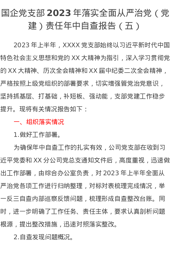 国企党支部2023年落实全面从严治党(党建)责任年中自查报告(五)