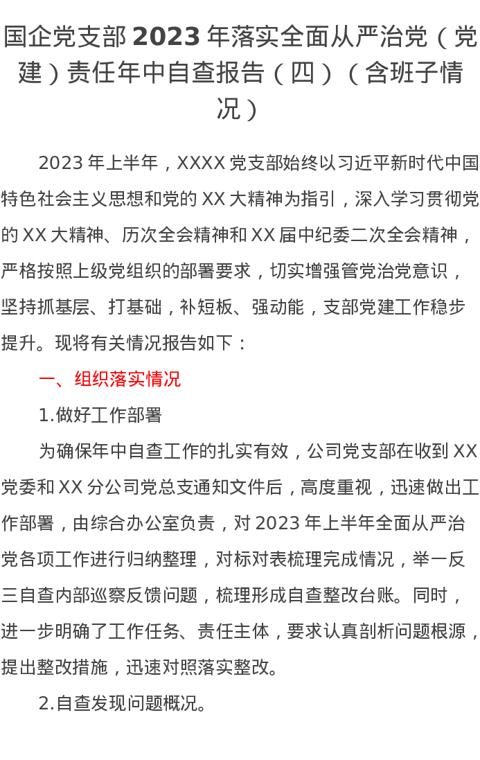 国企党支部2023年落实全面从严治党(党建)责任年中自查报告(四)(含班子情况)