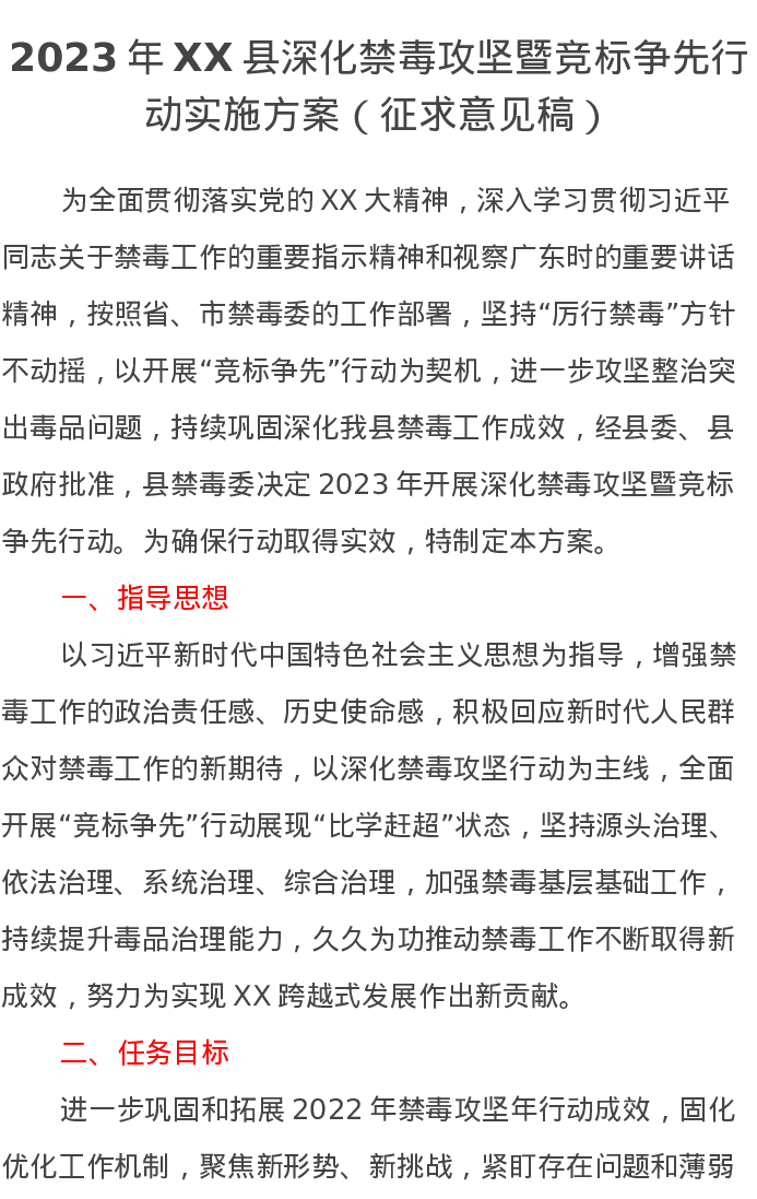 2023年XX县深化禁毒攻坚暨竞标争先行动实施方案(征求意见稿)