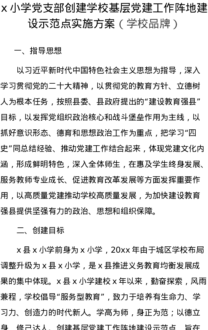 x小学党支部创建学校基层党建工作阵地建设示范点实施方案(学校品牌)