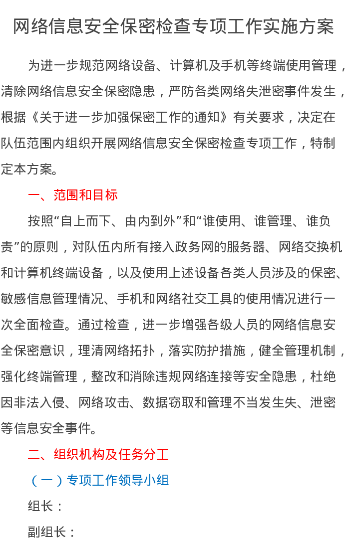 网络信息安全保密检查专项工作实施方案