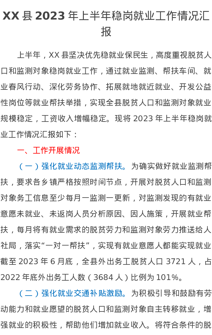 XX县2023年上半年稳岗就业工作情况汇报