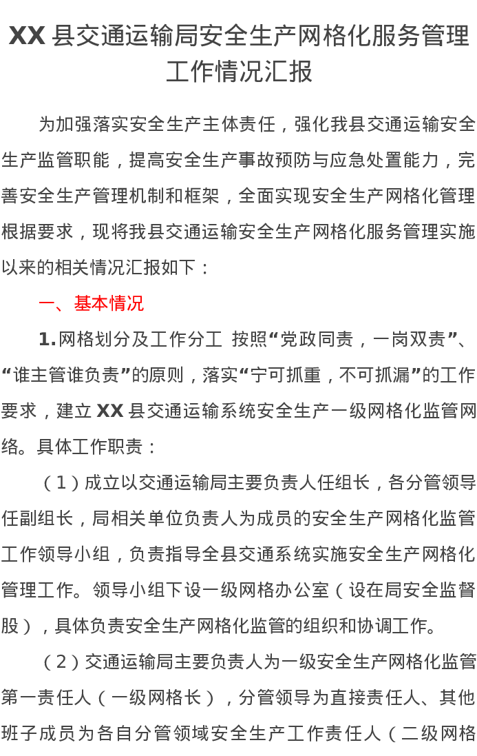 XX县交通运输局安全生产网格化服务管理工作情况汇报