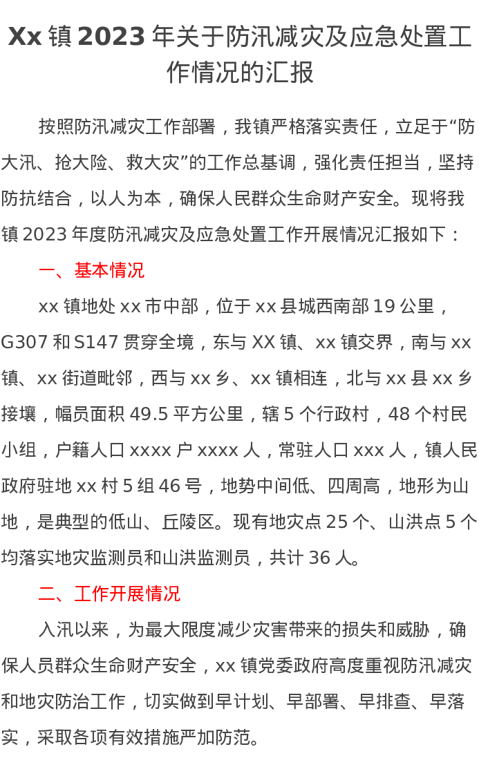Xx镇2023年关于防汛减灾及应急处置工作情况的汇报