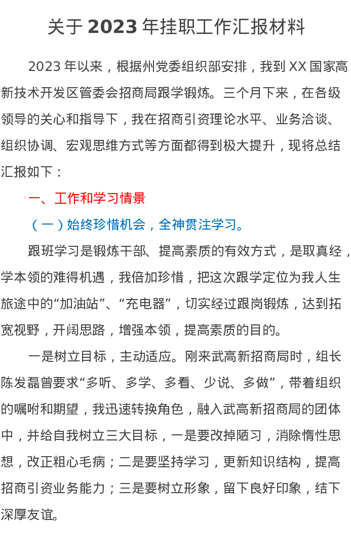 关于2023年挂职工作汇报材料