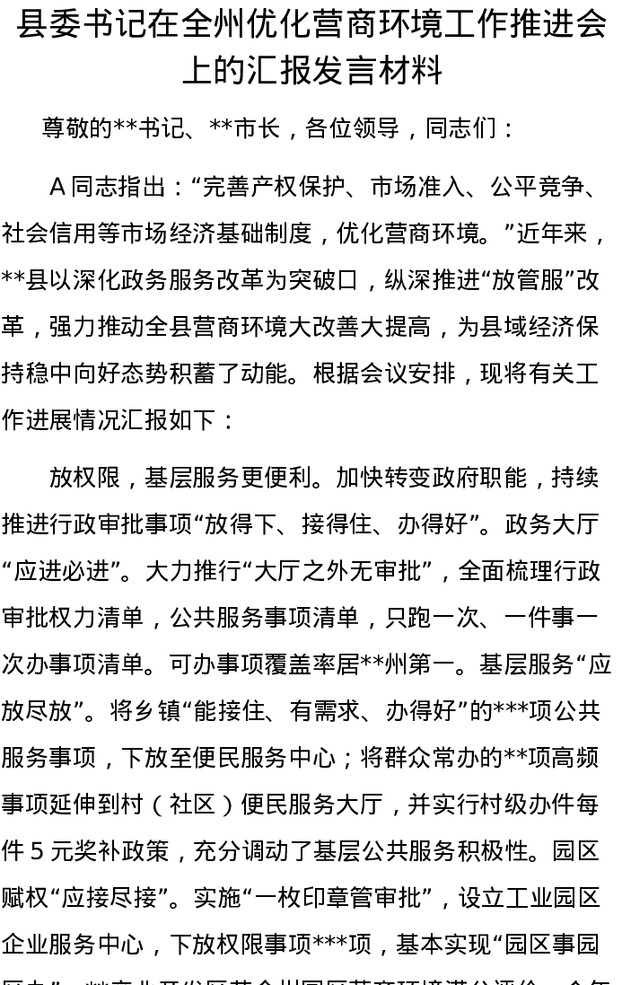县委书记在全州优化营商环境工作推进会上的汇报发言材料
