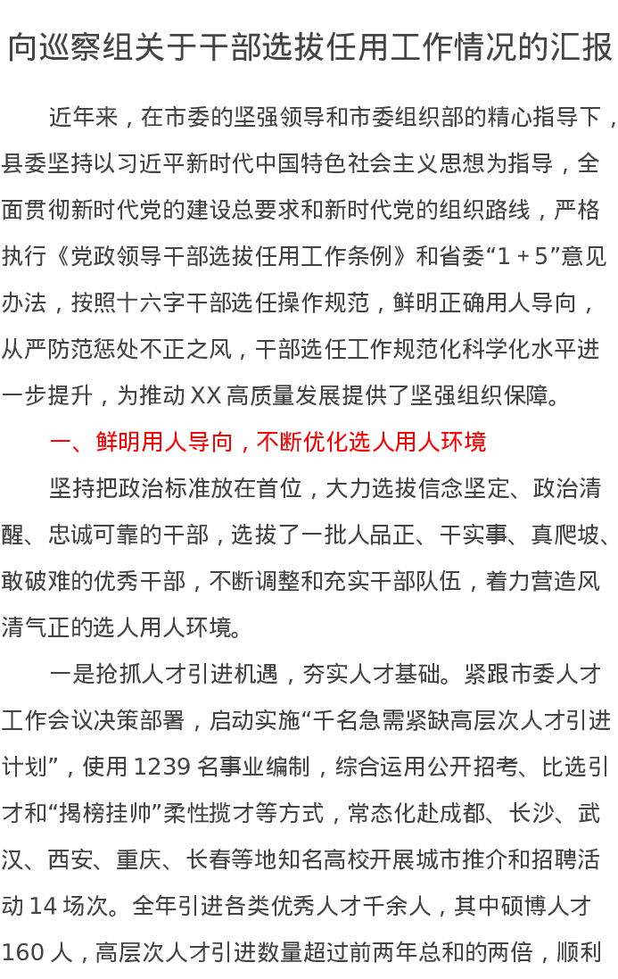 向巡察组关于干部选拔任用工作情况的汇报