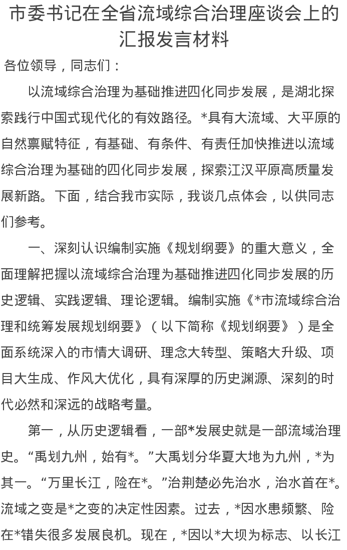 市委书记在全省流域综合治理座谈会上的汇报发言材料