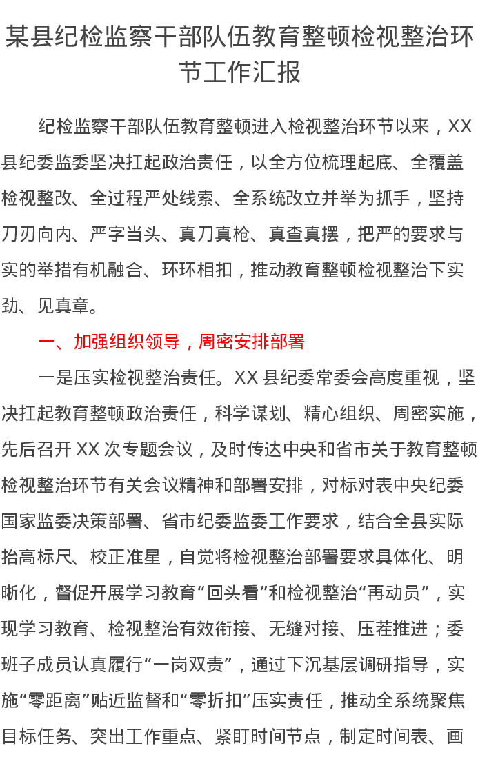 某县纪检监察干部队伍教育整顿检视整治环节工作汇报
