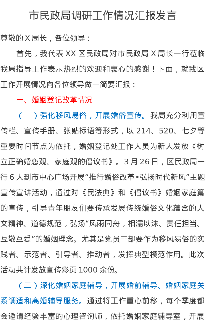市民政局调研工作情况汇报发言
