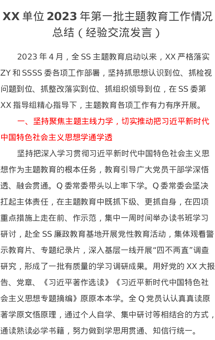 XX单位2023年第一批特色社会主义思想主题教育工作情况总结(经验交流发言)