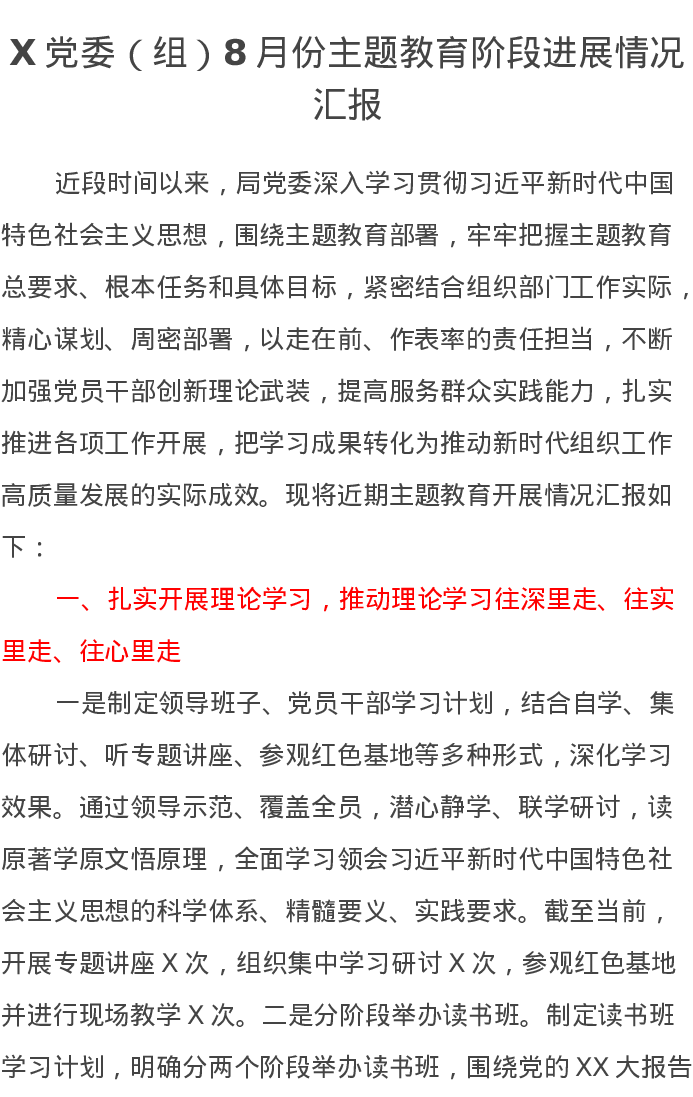 X党委(组)8月份主题教育阶段进展情况汇报(特色社会主义思想)