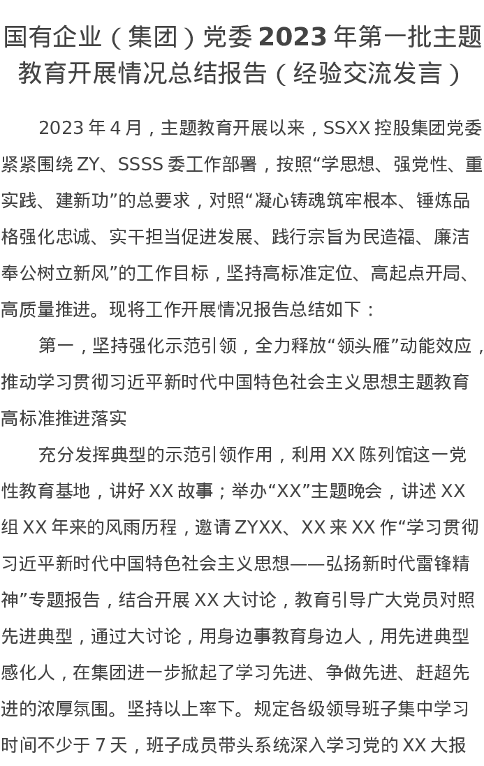 国有企业(集团)党委2023年第一批特色社会主义思想主题教育开展情况总结报告(经验交流发言)