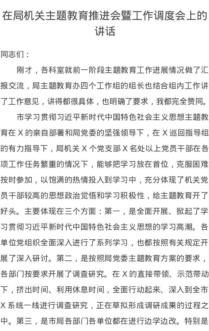 在局机关主题教育推进会暨工作调度会上的讲话(特色社会主义思想)