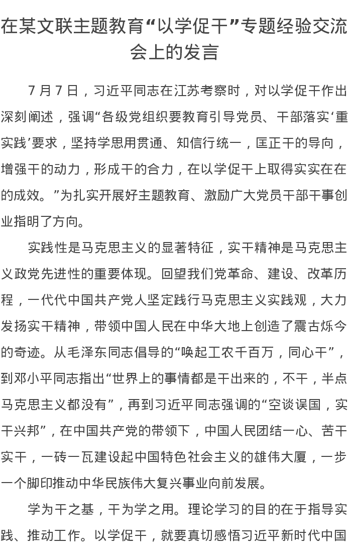 在某文联主题教育“以学促干”专题经验交流会上的发言(特色社会主义思想)