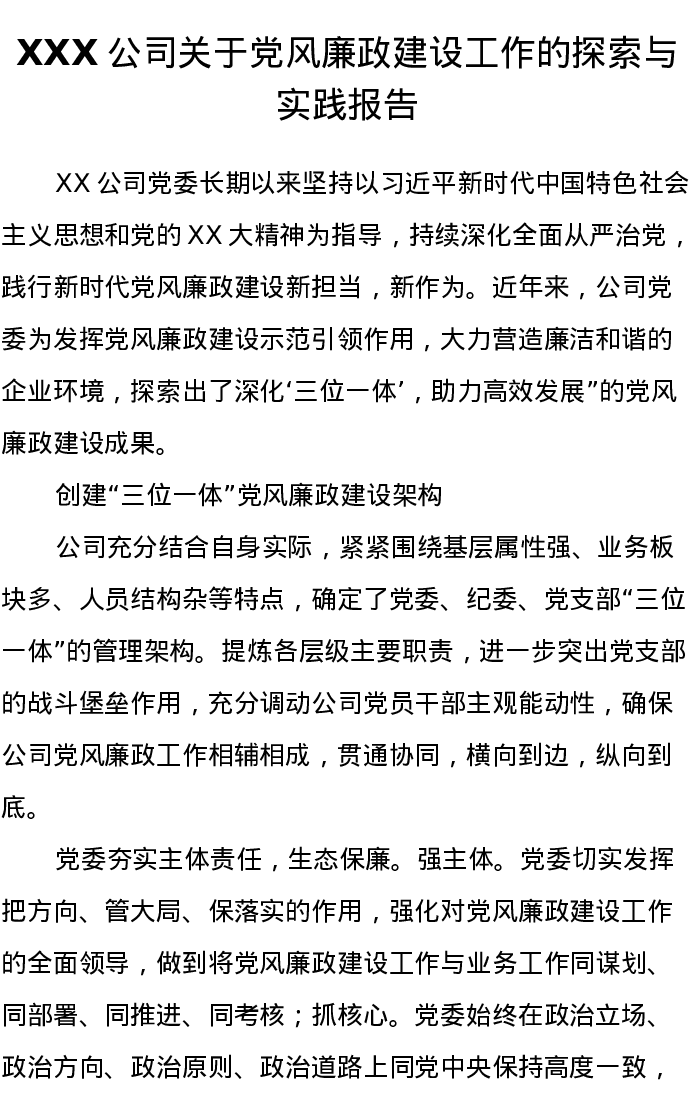 XXX公司关于党风廉政建设工作的探索与实践报告