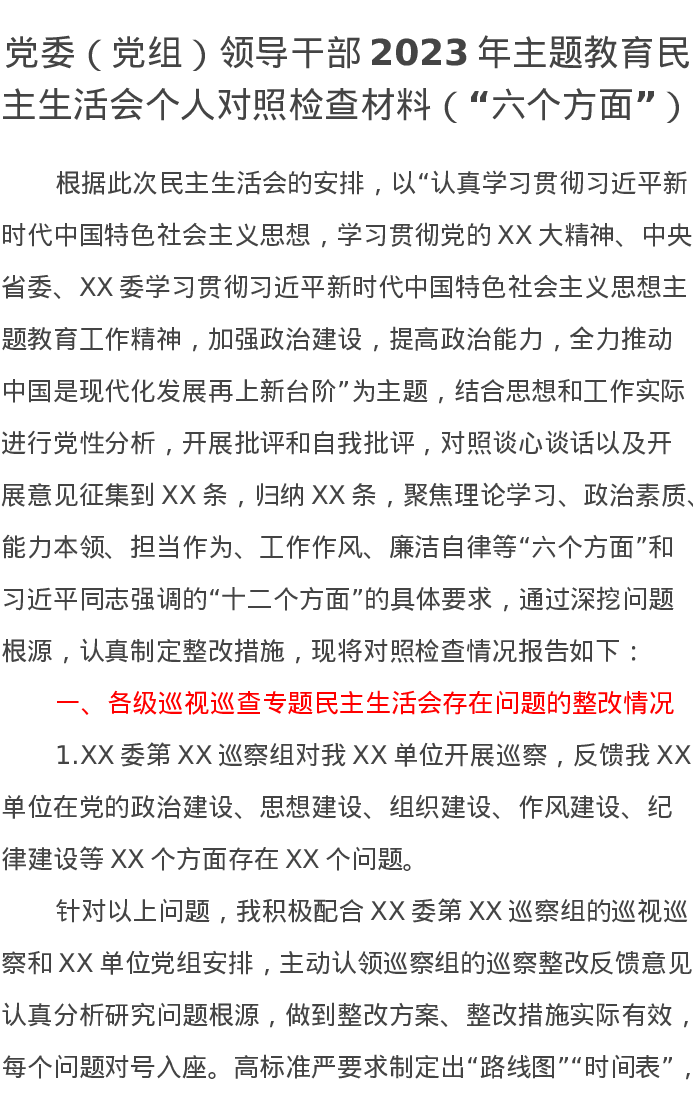 党委(党组)领导干部2023年主题教育民主生活会个人对照检查材料(“六个方面”+特色社会主义思想)