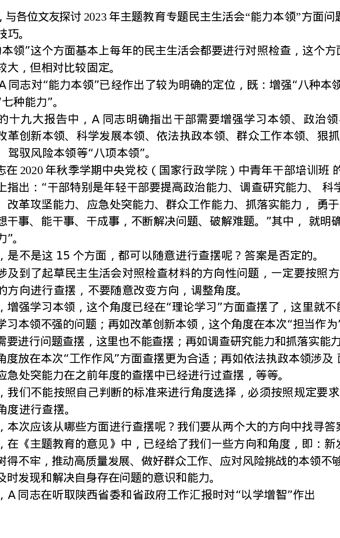 第三方面:2023年主题教育专题民主生活会“能力本领”方面问题起草指南、实例和素材93条(特色社会主义思想)