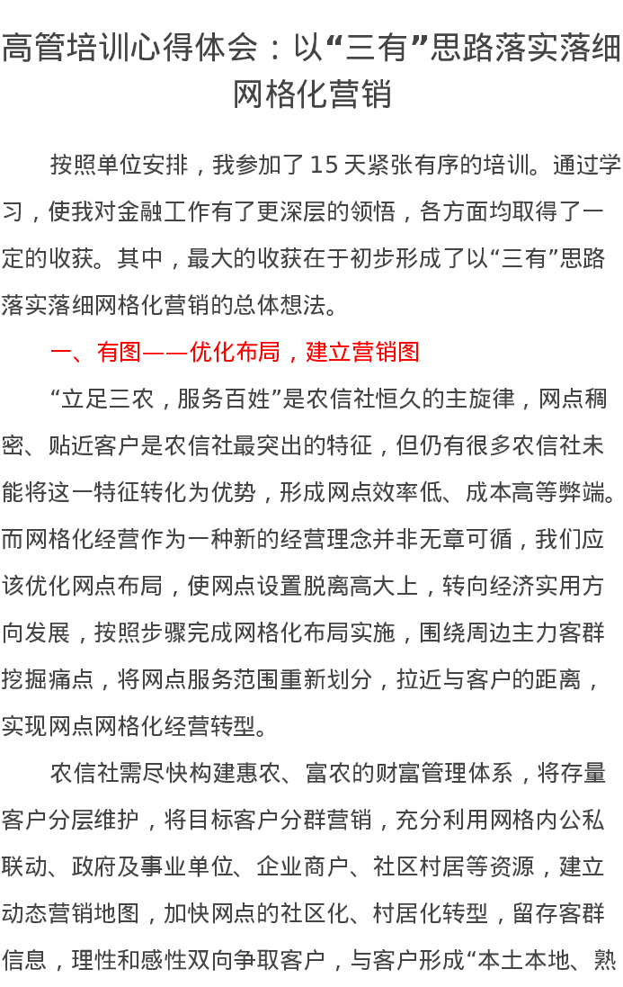 高管培训心得体会:以“三有”思路落实落细网格化营销